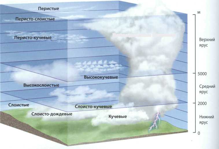 Поэтому облака горизонтального развития подразделяют на облака нижнего яруса (высота нижней границы облака от 0,1—0,4 км до 1 км), облака среднего яруса (высота нижней границы от 2 до 5 км), облака верхнего яруса (высота нижней границы от 6 до 10 км).