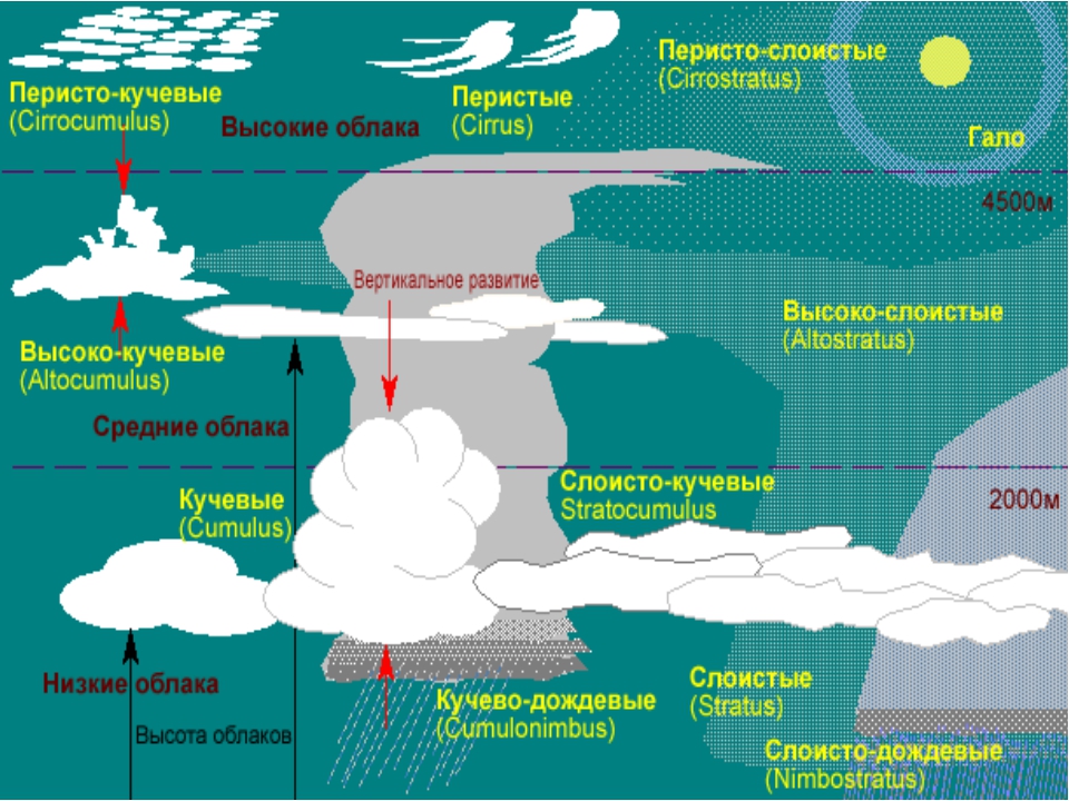 Из них восемь относят к категории облаков горизонтального развития (их называют слоистообразными облаками), а две формы — к категории облаков вертикального развития (их называют также кучевообразными облаками).