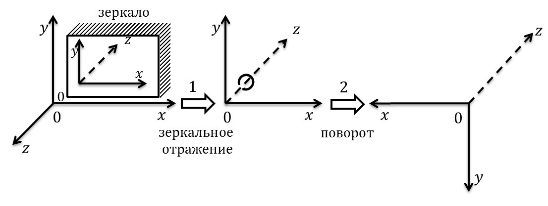 1) зеркальному отражению в какой-либо плоскости. Например, в плоскости ХОY (см. рис. «Демонстрация операции пространственной инверсии относительно трёхмерной системы координат»);