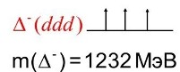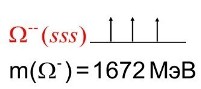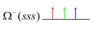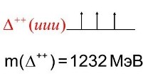куплета занимает только одна частица, состоящая из комбинации s-кварков, образуя изосинглет ( ). Таким образом, получается, что в вершинах построенного треугольного декуплета располагаются частицы, построенные из комбинаций трёх тождественных кварков, находящихся в одних и тех же квантовых состояниях:  – из -кварков,  – из - кварков и  – из . Действительно, у всех частиц  орбитальный момент равен нулю. А так как все кварки являются фермионами, их спин равен . И несмотря на то, что для них возможны две проекции спина на выделенное направление (  и ), для того чтобы образовалось состояние ,  у всех трёх кварков (u, d и s) они должны быть одинаковыми. В каждом барионе три тождественных кварка имеют одинаковые квантовые числа.