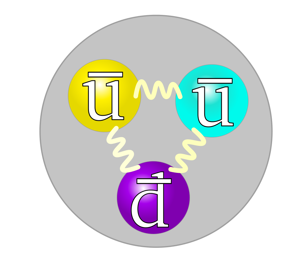Для объяснения существования структуры антипротона и антинейтрона антикваркам приписали антицвета: антикрасному – голубой; антисинему – жёлтый, антизелёному – пурпурный. Комбинации из антикварков, в которых все три антицвета представлены в равной степени, также являются цветовыми синглетами.  То есть, и в этом случае  равномерная   смесь   трёх   базовых   цветов     даёт    абсолютно    бесцветную    (белую