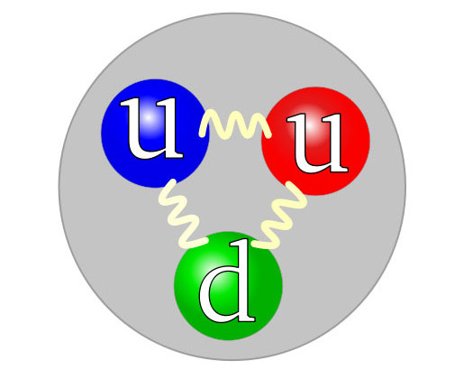 При удалении их друг от друга силы механического напряжения пружины будут удерживать их вместе, и на расстоянии примерно равном размеру протона, они уже будут соответствовать весу 16 т. Для разделения двух таких частиц понадобилась бы бесконечно большая энергия. Предполагается, что свободное существование кварков было возможным лишь в первые моменты после большого взрыва, когда существовали огромные температуры.